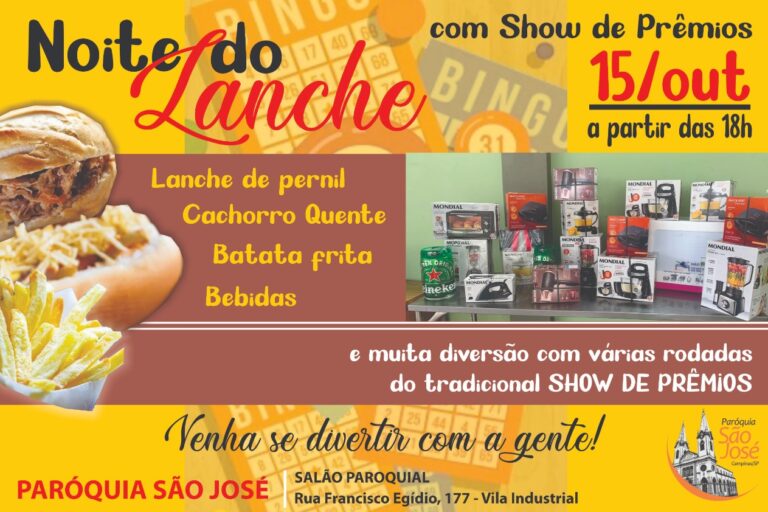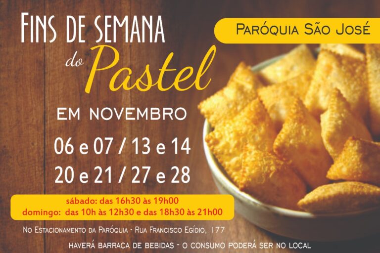 A fim de obter recursos para ajudar nas despesas de nossa Paróquia, realizaremos durante o mês de NOVEMBRO nos finais de semana, após as missas, FINS DE SEMANA DO PASTEL no SALÃO PAROQUIAL. Você poderá saborear os deliciosos pasteis da São José, levando para sua casa, ou reunindo a família após as missas no Salão…