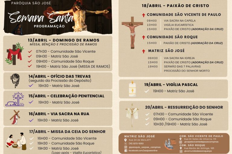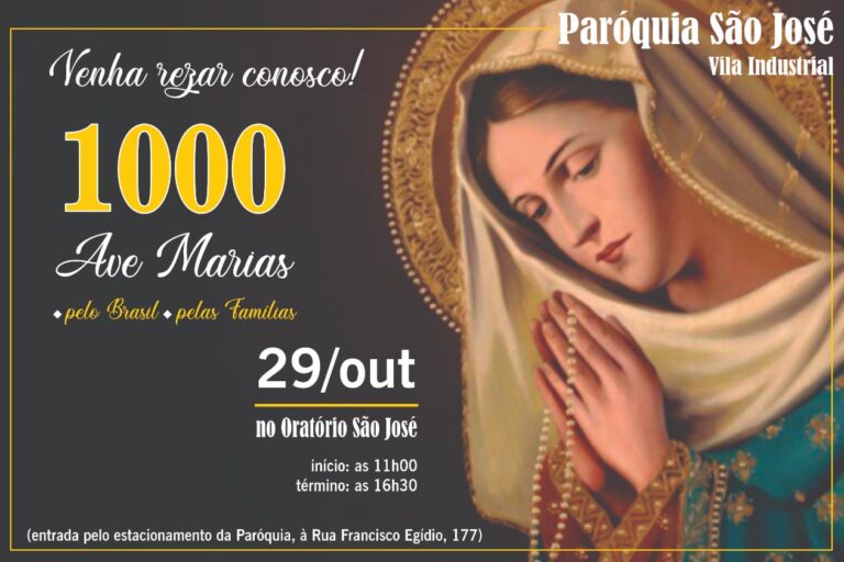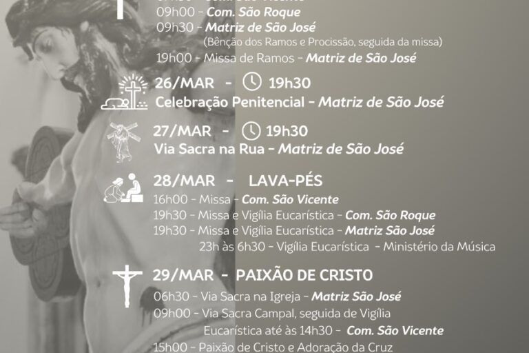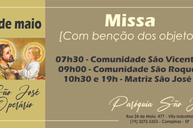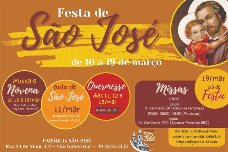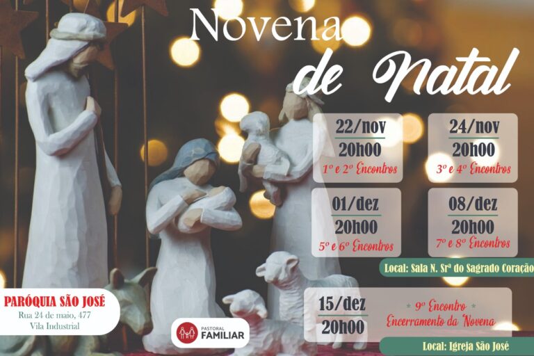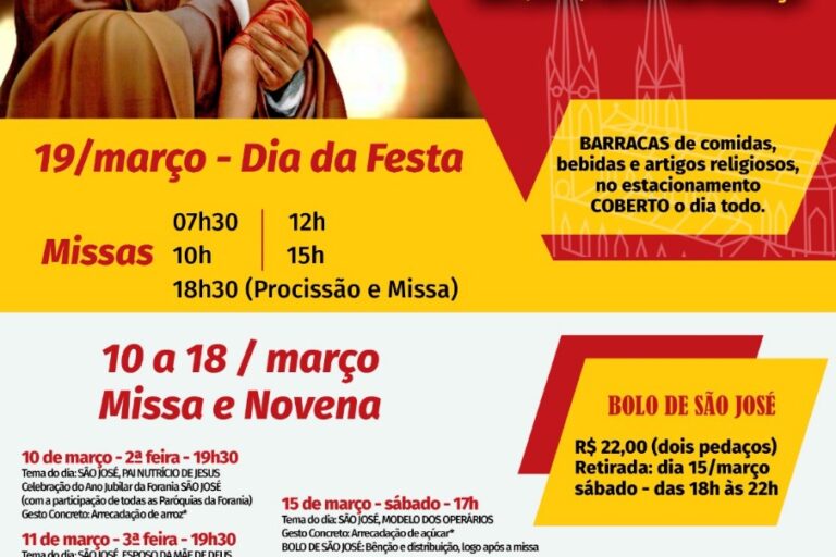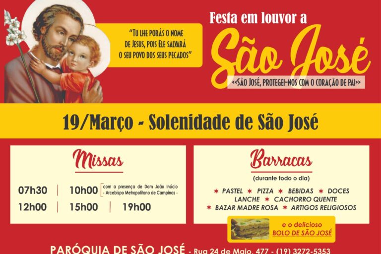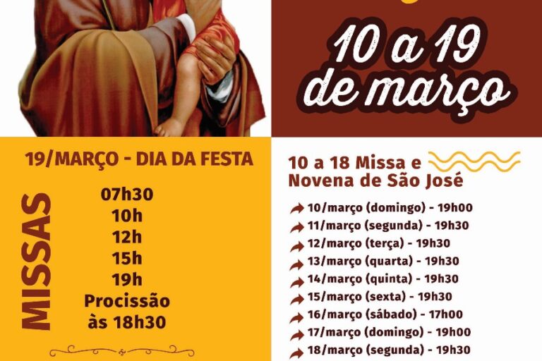Novena de São José: 10/mar (sexta) 19h30 – Missa e Novena 11/mar (sábado) 17h00 – Missa e Novena 12/mar (domingo) 19h00 – Missa e Novena 13/mar (segunda) 19h30 – Missa e Novena 14/mar (terça) 19h30 – Missa e Novena 15/mar (quarta) 19h30 – Missa e Novena 16/mar (quinta) 19h30 – Missa e Novena 17/mar (sexta)…