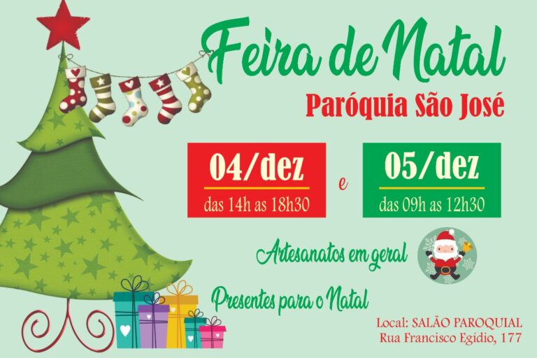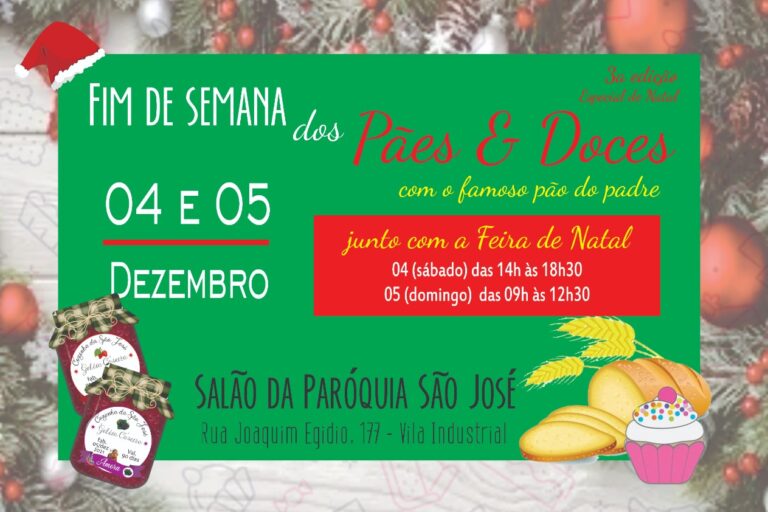 Com o objetivo de obter recursos para a nossa Paróquia, realizaremos nos dias 04 e 05 de dezembro, o final de semana dos PÃES E DOCES – 3ª edição, junto com a Feira de Natal. Os produtos, preparados com muito carinho e gentilmente doados pelos nossos agentes de pastoral, estarão a venda no Salão Paroquial.…