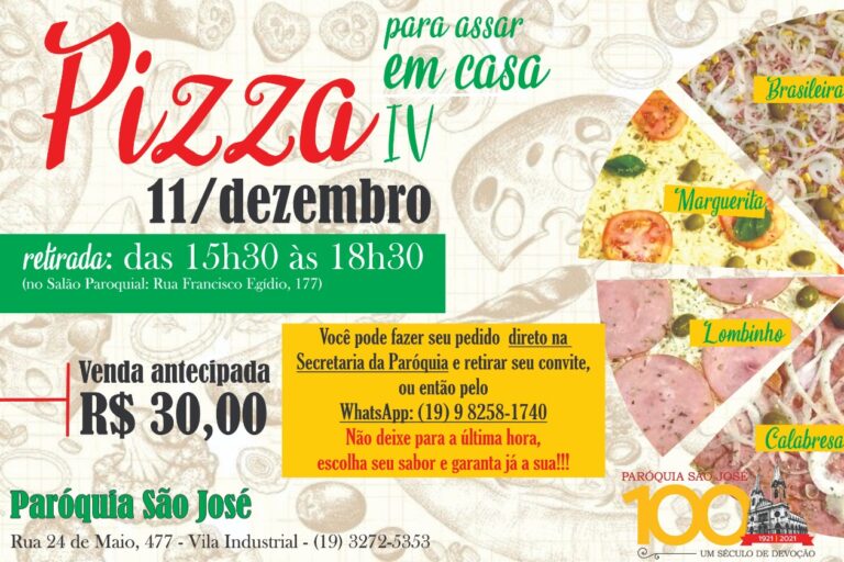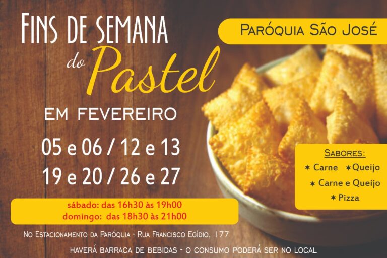 A fim de obter recursos para ajudar nas despesas de nossa Paróquia, realizaremos durante o mês de FEVEREIRO nos finais de semana, após as missas, FINS DE SEMANA DO PASTEL no SALÃO PAROQUIAL. Você poderá saborear os deliciosos pasteis da São José, levando para sua casa, ou reunindo a família após as missas no Salão…