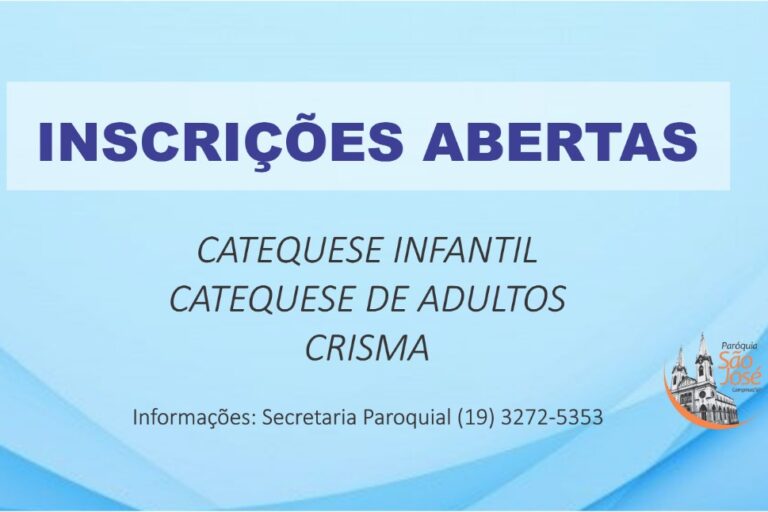 Encontram-se abertas as inscrições para a Catequese Infantil, Catequese de Adultos e Crisma. Estas podem ser feitas na Secretaria da Paróquia ou nas missas nos finais de semana. Informações a seguir ou Secretaria Paroquial (19) 3272-5353. Idade necessária: 9 anos completos até dia 30/jun Dados de contato dos pais Os encontros…