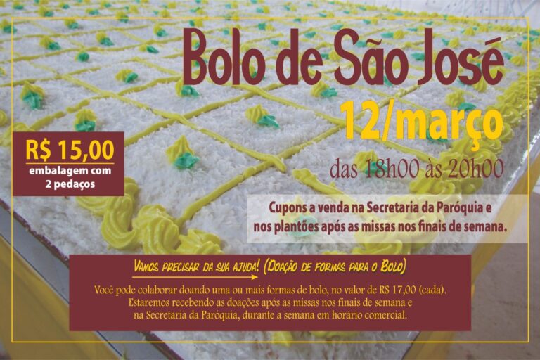 Venda antecipada do bolo de São José: cupons disponíveis nas missas e na Secretaria da Paróquia, no valor de R$15,00. A retirada será dia 12/03. Você pode colaborar doando uma ou mais formas de bolo, no valor de R$17,00 cada.