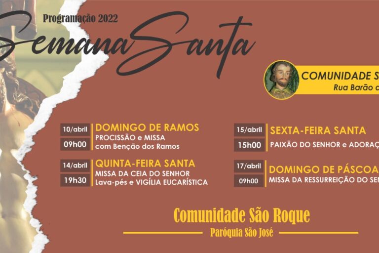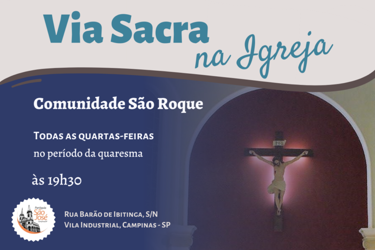 Convidamos você a rezar a Via Sacra, na Comunidade São Roque (Rua Ibitinga, s/n – Vila Industrial), todas às quartas-feiras às 19h30, durante o tempo da Quaresma. “O tema escolhido para esse importante tempo da Campanha Fraternidade 2023 foi: “Fraternidade e fome”; com o lema: “Dai-lhes vós mesmos de comer” (Mt 14,16). Meditando os passos…