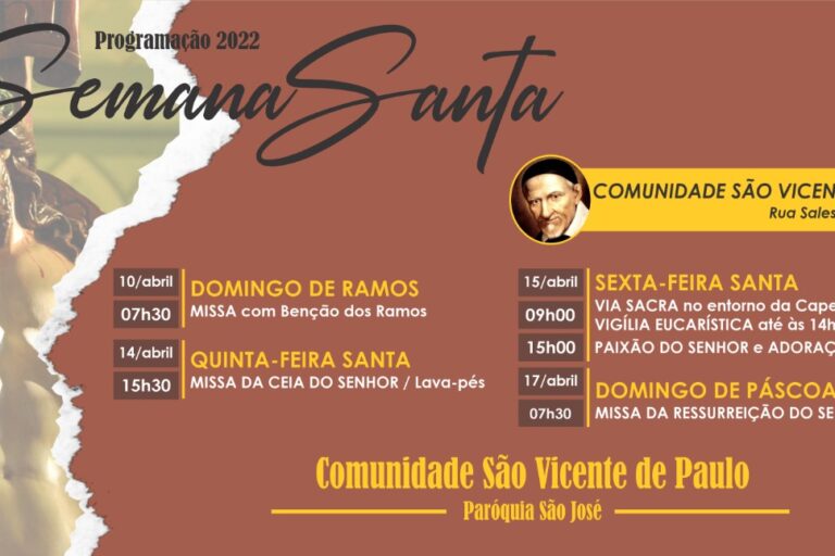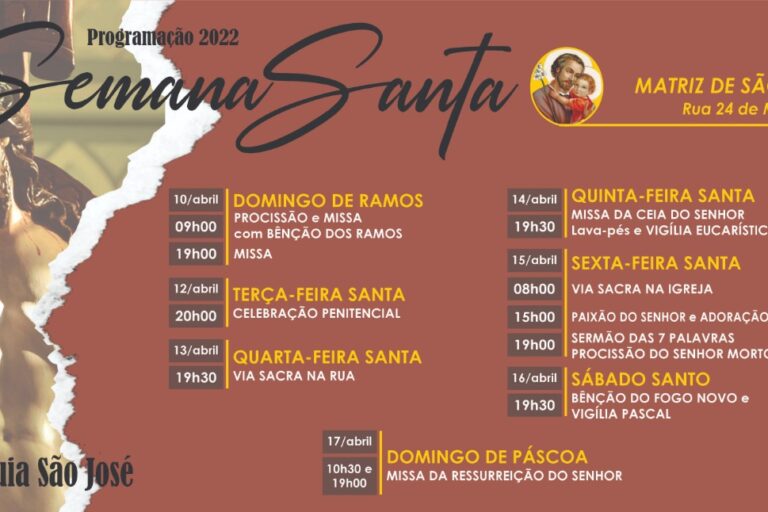 10/mar (domingo) 19h00 – Missa e Novena 11/mar (segunda) 19h30 – Missa e Novena 12/mar (terça) 19h30 – Missa e Novena 13/mar (quarta) 19h30 – Missa e Novena 14/mar (quinta) 19h30 – Missa e Novena 15/mar (sexta) 19h30 – Missa e Novena 16/mar (sábado) 17h00 – Missa e Novena 17/mar (domingo) 19h00 – Missa e…