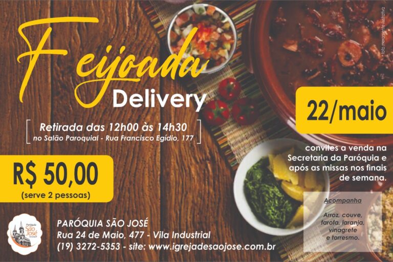 A Feijoada estará a venda nas missas do próximo fim de semana e a partir da próxima 3a feira, dia 26/04, na Secretaria da Paróquia.