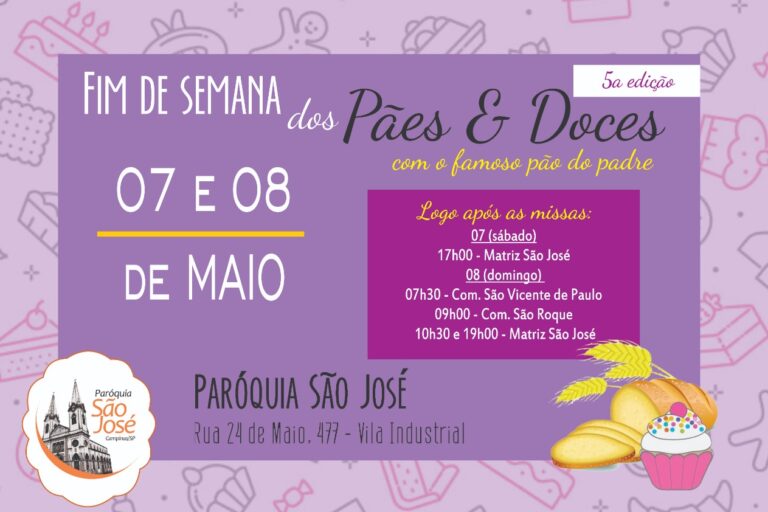 Com o objetivo de obter recursos para a nossa Paróquia, realizaremos nos dias 07 e 08 de maio, o final de semana dos PÃES E DOCES – 5ª edição. Também teremos o famoso PÃO DO PADRE, confeccionado pelo nosso querido Pe Sandro. Venha experimentar essas gostosuras! Contamos com a colaboração de todos.