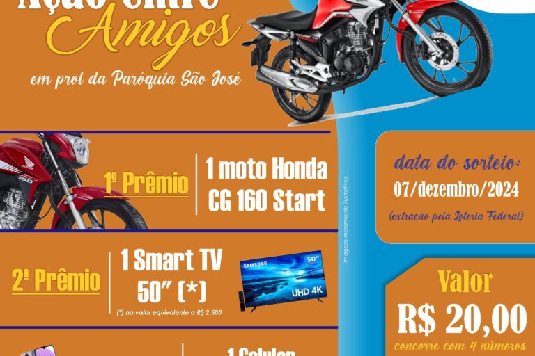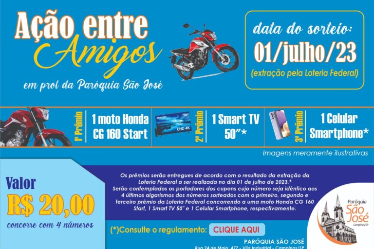 Esta Ação entre amigos visa arrecadar fundos para a Paróquia São José. As vendas serão realizadas durante os dias da semana na Secretaria da Igreja e, nos finais de semana, após as missas. Para conferir o regulamento: Clique aqui