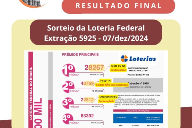 Sorteio da Loteria Federal – Extração 5925 – 07/12/2024 Conforme consta no Regulamento, a entrega dos prêmios se dará da seguinte forma: “Da entrega do prêmio Cláusula 9 – A entrega do prêmio será feita, mediante a apresentação do respectivo Cupom, que será identificado por idêntico número no canhoto e de documento original de identidade…