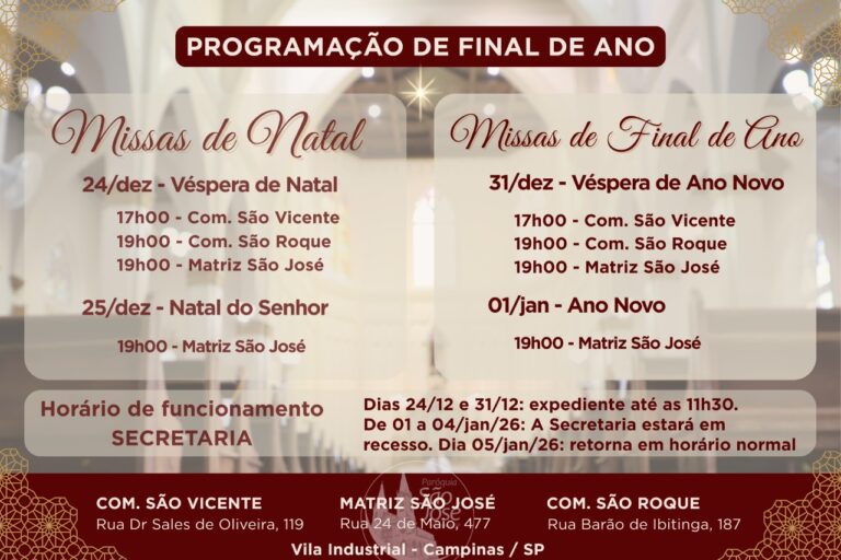Acompanhe os horários das missas de Final de ano da Paróquia.