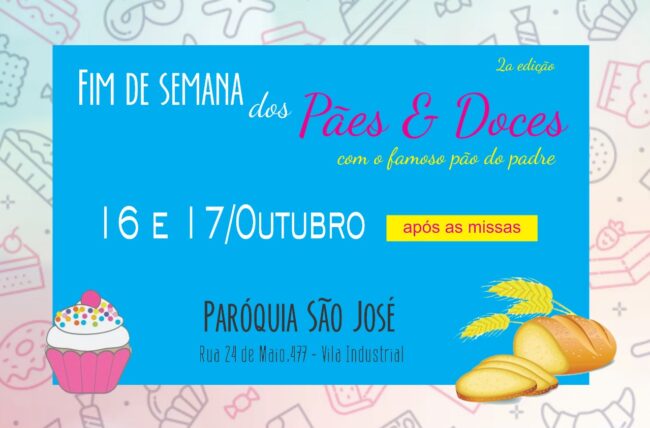Com o objetivo de obter recursos para a nossa Paróquia, realizaremos nos dias 04 e 05 de dezembro, o final de semana dos PÃES E DOCES – 3ª edição, junto com a Feira de Natal. Os produtos, preparados com muito carinho e gentilmente doados pelos nossos agentes de pastoral, estarão a venda no Salão Paroquial.…