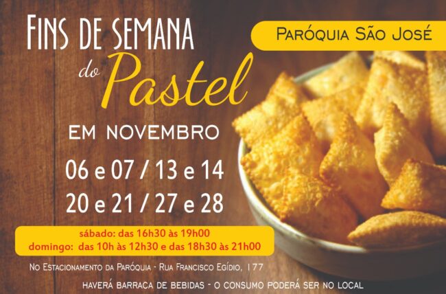 A fim de obter recursos para ajudar nas despesas de nossa Paróquia, realizaremos durante o mês de NOVEMBRO nos finais de semana, após as missas, FINS DE SEMANA DO PASTEL no SALÃO PAROQUIAL. Você poderá saborear os deliciosos pasteis da São José, levando para sua casa, ou reunindo a família após as missas no Salão…