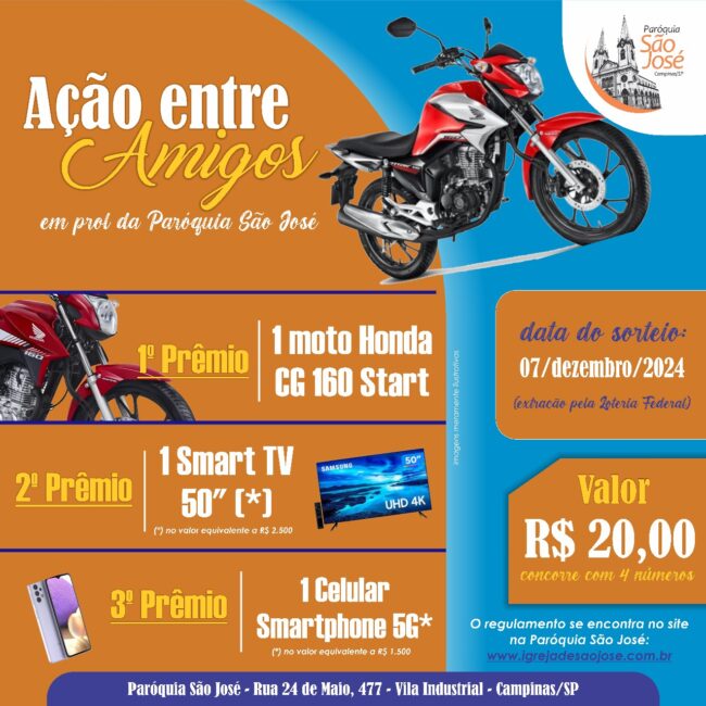 Não perca essa oportunidade! Será sua chance de concorrer a grandes prêmios e ainda ajudar a Paróquia São José! 🙏🏻🥳 Participe da Ação entre Amigos ❤️ ➡️Os recursos obtidos têm a finalidade de ajudar na manutenção e melhorias da Igreja, como consertos e reformas. Regulamento Ação entre Amigos 2024