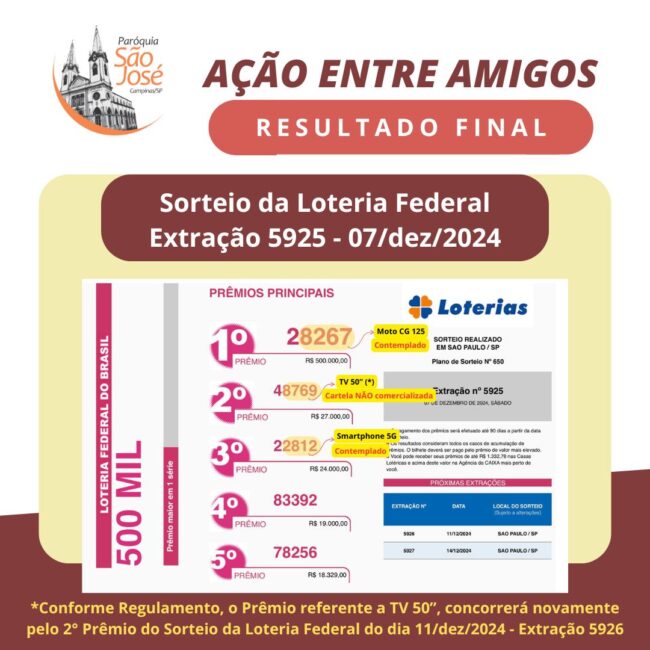 Sorteio da Loteria Federal – Extração 5925 – 07/12/2024 Conforme consta no Regulamento, a entrega dos prêmios se dará da seguinte forma: “Da entrega do prêmio Cláusula 9 – A entrega do prêmio será feita, mediante a apresentação do respectivo Cupom, que será identificado por idêntico número no canhoto e de documento original de identidade…