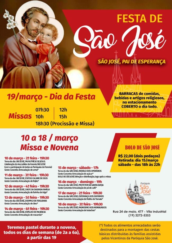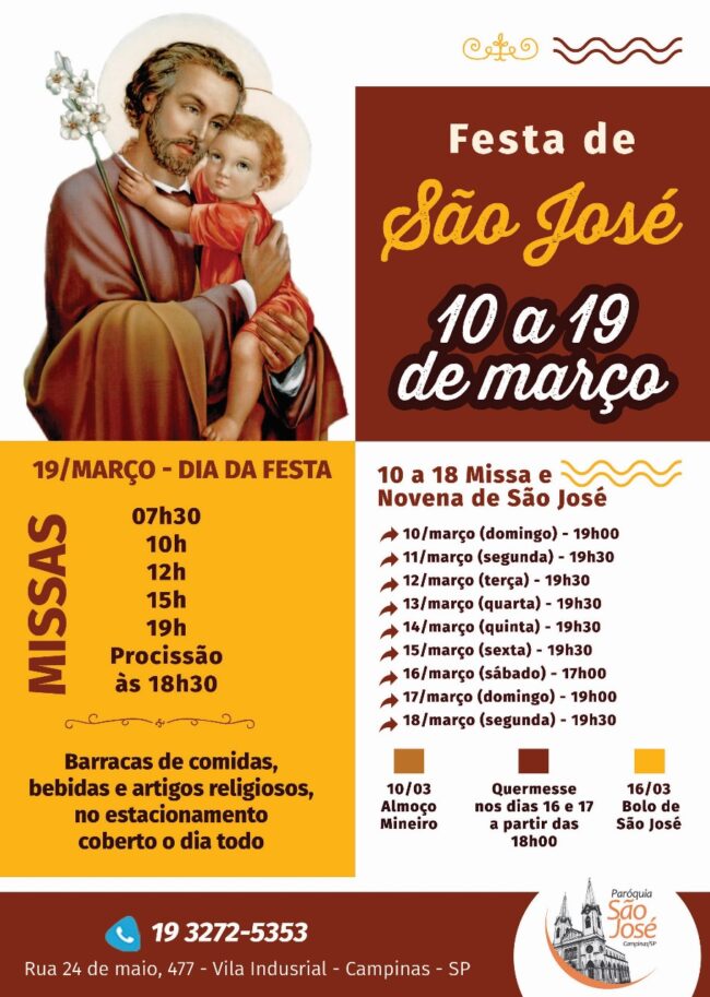 10/mar (domingo) 19h00 – Missa e Novena 11/mar (segunda) 19h30 – Missa e Novena 12/mar (terça) 19h30 – Missa e Novena 13/mar (quarta) 19h30 – Missa e Novena 14/mar (quinta) 19h30 – Missa e Novena 15/mar (sexta) 19h30 – Missa e Novena 16/mar (sábado) 17h00 – Missa e Novena 17/mar (domingo) 19h00 – Missa e…