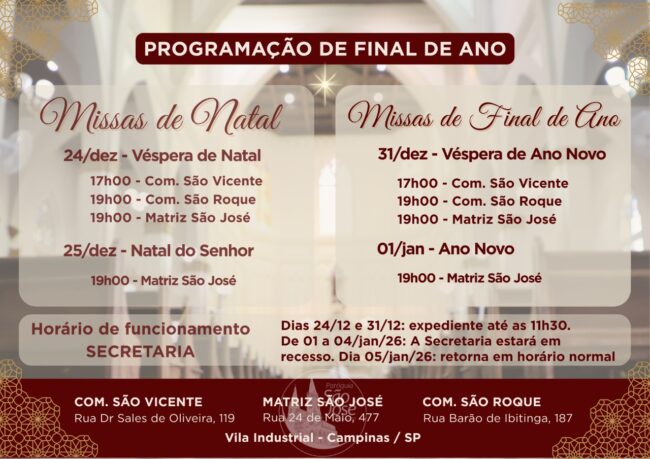 Acompanhe os horários das missas de Final de ano da Paróquia.