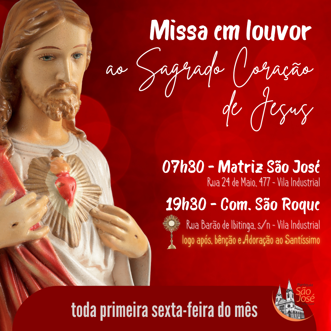 Missa em louvor ao Sagrado Coração de Jesus. Toda 1a sexta-feira do mês. Category: ReligiosoNavegação de post:AnteriorPost anterior:Via Sacra Quaresma 2024PróximoPróximo post:Missa de São José – Todo dia 19 de cada mêsRelated PostsProgramação do Final de Ano15 de dezembro de 2025Festa de São José 20256 de março de 2025Quaresma 20254 de março de 2025Missa de Cinzas27 de fevereiro de 2025Quaresma 202429 de fevereiro de 2024Missa de São José – Todo dia 19 de cada mês29 de fevereiro de 2024
