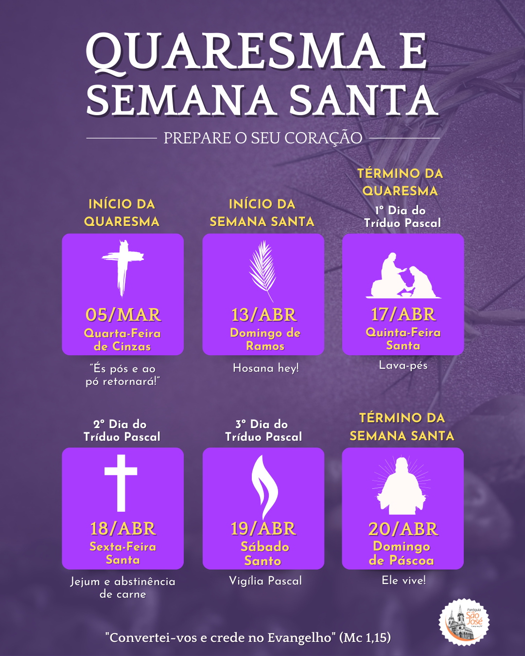 Category: ReligiosoNavegação de post:AnteriorPost anterior:Missa de CinzasPróximoPróximo post:Festa de São José 2025Related PostsProgramação do Final de Ano15 de dezembro de 2025Festa de São José 20256 de março de 2025Missa de Cinzas27 de fevereiro de 2025Quaresma 202429 de fevereiro de 2024Missa de São José – Todo dia 19 de cada mês29 de fevereiro de 2024Missa 1a Sexta-feira do mês29 de fevereiro de 2024