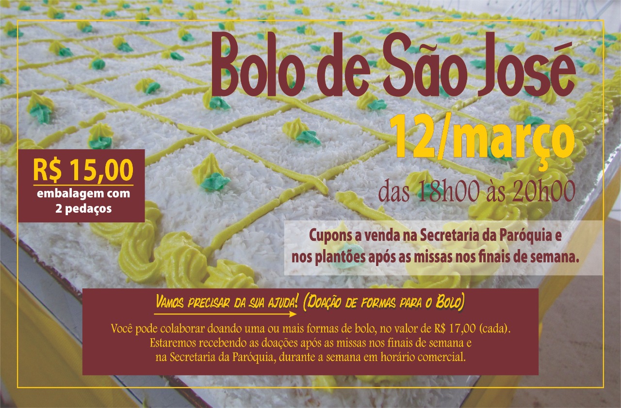 Venda antecipada do bolo de São José: cupons disponíveis nas missas e na Secretaria da Paróquia, no valor de R$15,00. A retirada será dia 12/03.