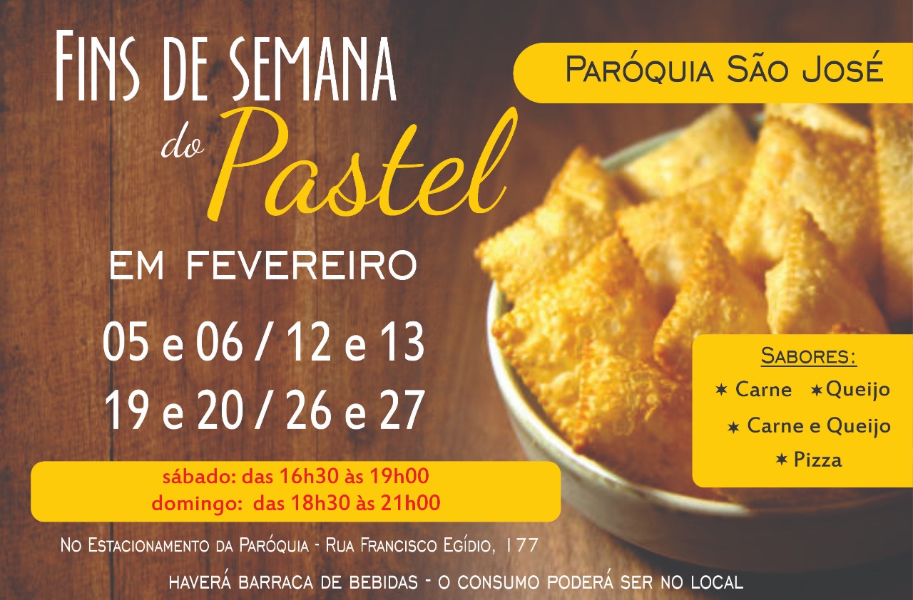 A fim de obter recursos para ajudar nas despesas de nossa Paróquia, realizaremos durante o mês de FEVEREIRO nos finais de semana, após as missas, FINS DE SEMANA DO PASTEL no SALÃO PAROQUIAL.